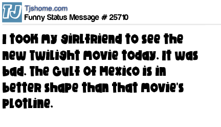 X I took my girlfriend to see the new Twilight movie today. It was bad. The Gulf Of Mexico is in better shape than that movie's plotline.