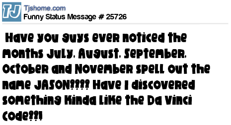X is Have you guys ever noticed the months July, August, September, October and November spell out the name JASON???? Have I discovered something kinda like the Da Vinci Code??!