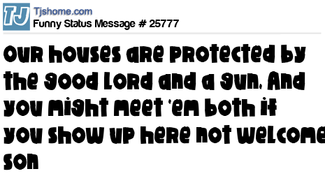 X says Our houses are protected by the good Lord and a gun, And you might meet 'em both if you show up here not welcome son