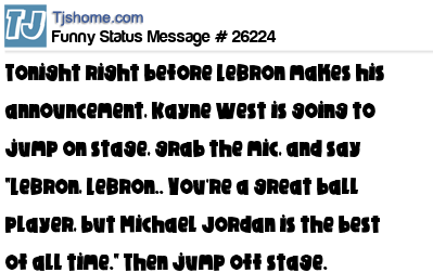 X is Tonight right before LeBron makes his announcement, Kayne West is going to jump on stage, grab the mic, and say "LeBron, LeBron.. You're a great ball player, but Michael Jordan is the best of all time." Then jump off stage.
