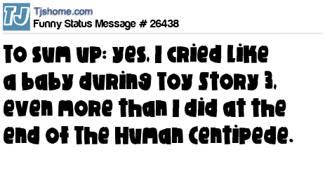 X To sum up: yes, I cried like a baby during Toy Story 3, even more than I did at the end of The Human Centipede.