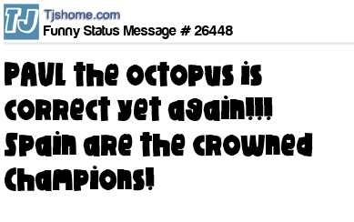 - # 26447 The octopus PAUL has predicted it correct yet again. Spain are the Champions. I need to meet this PAUL and ask him to select which girl should I Propose to. It's time I settle for one girl, having 3 girlfriends Sucks bigtime!!