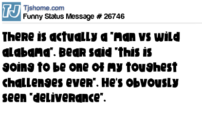 X says There is actually a "man vs wild alabama". Bear said "this is going to be one of my toughest challenges ever". He's obvously seen "deliverance".