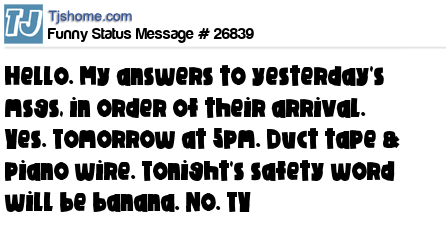 X says Hello. My answers to yesterday's msgs, in order of their arrival. Yes. Tomorrow at 5pm. Duct tape & piano wire. Tonight's safety word will be banana. No. TY