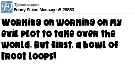 X is Working on working on my evil plot to take over the world. But first, a bowl of Froot Loops!