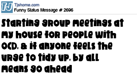 - # 60961 I'll be starting group meetings at my house for people with OCD. Not because I have it, but because I know someone will get the urge to clean up my damm house! OCD'ers...Cheaper than maid service!