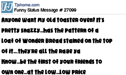 X is anyone want my old toaster oven? It's pretty snazzy…has the pattern of a loaf of Wonder Bread stained on the top of it….they're all the rage ya know…be the first of your friends to own one…at the low…low price of——-> FREE!”