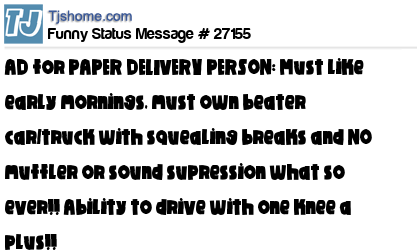 X AD for PAPER DELIVERY PERSON: Must like early mornings, must own beater car/truck with squealing breaks and NO muffler or sound supression what so ever!! Ability to drive with one knee a plus!!