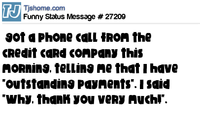 X got a phone call from the credit card company this morning, telling me that I have "outstanding payments". I said "Why, thank you very much!".