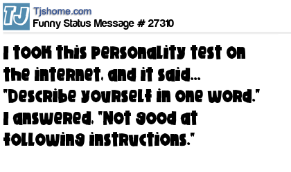 - # 54961 Just took this personality test, and it said. "Describe yourself in one word." I answered, "Not good at following instructions."