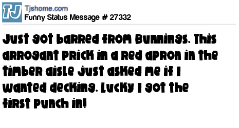 X just got barred from Bunnings. This arrogant prick in a red apron in the timber aisle just asked me if I wanted decking. Lucky I got the first punch in!