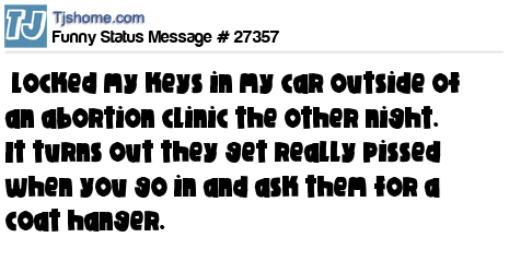 - # 69897 I locked my keys in my car outside of an abortion clinic the other night. It turns out they get really pissed when you go in and ask them for a coat hanger.