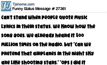 X Can't stand when people quote music lyrics in their status. we know how the song goes, we already heard it 500 million times on the radio. but "Can we pretend that airplanes in the night sky are like shooting stars," "ops I did it again," "somebody call 9