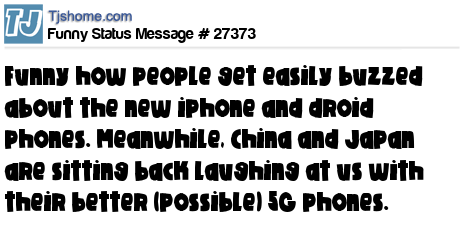 X Funny how people get easily buzzed about the new iphone and droid phones. Meanwhile, China and Japan are sitting back laughing at us with their better (possible) 5G phones.