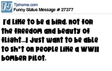 X   I'd like to be a bird, not for the freedom and beauty of flight...I just want to be able to sh*t on people like a WWII bomber pilot.