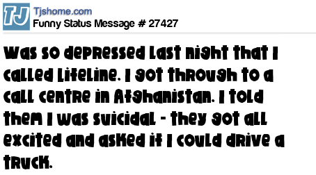 X was so depressed last night that I called Lifeline. I got through to a call centre in Afghanistan. I told them I was suicidal - they got all excited and asked if I could drive a truck.