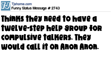 - # 77012 We need a twelve-step group for compulsive talkers. They would call it On Anon Anon.