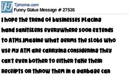 X  I hope the trend of businesses placing hand sanitizers everywhere soon extends to ATMs.Imagine what germs the slobs who use my ATM are carrying,considering they can't even bother to either take their receipts or throw them in a garbage can 6 inches away