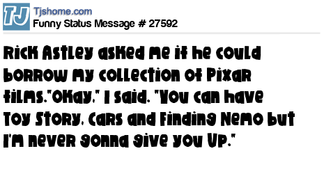 - # 28764 Rick Astley asked me if he could borrow my collection of Pixar films. "Okay," I said. "You can have Toy Story, Cars and Finding Nemo but I'm never gonna give you Up."