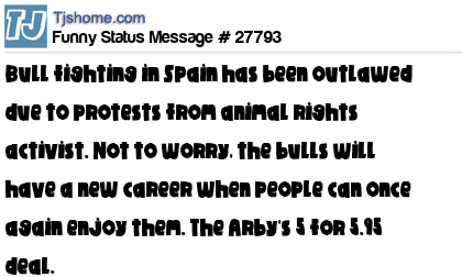 X says Bull fighting in Spain has been outlawed due to protests from animal rights activist. Not to worry, the bulls will have a new career when people can once again enjoy them. The Arby's 5 for 5.95 deal.