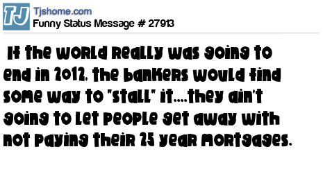 X If the world really was going to end in 2012, the bankers would find some way to "stall" it....they ain't going to let people get away with not paying their 25 year mortgages.