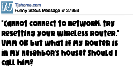 - # 97130 One of my friends just called me and said his internet was not working...I told him to reset his router and he said "I can't, it's in my neighbors house" LOL