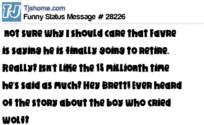 X is not sure why I should care that Favre is saying he is finally going to retire. Really? Isn't like the 15 millionth time he's said as much? Hey Brett! Ever heard of the story about the boy who cried wolf?