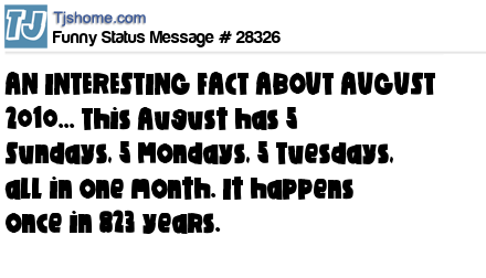 X AN INTERESTING FACT ABOUT AUGUST 2010... This August has 5 Sundays, 5 Mondays, 5 Tuesdays, all in one month. It happens once in 823 years.