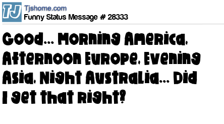 X Good... Morning America, Afternoon Europe, Evening Asia, Night Australia... Did I get that right?