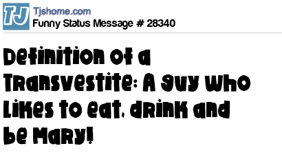X Definition of a Transvestite: A guy who likes to eat, drink and be Mary!
