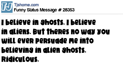 X I believe in ghosts. I believe in aliens. But theres no way you will ever persuade me into believing in alien ghosts. Ridiculous.