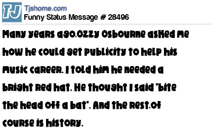 - # 13224 Many years ago,Ozzy Osbourne asked me how he could get publicity to help his music career. I told him he needed a bright red hat. He thought I said "bite the head off a bat". And the rest,of course is history.