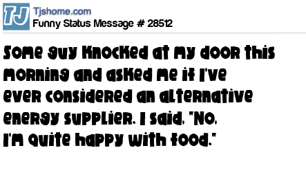 X Some guy knocked at my door this morning and asked me if I've ever considered an alternative energy supplier. I said, "No, I'm quite happy with food."