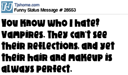 X You know who I hate? Vampires. They can't see their reflections, and yet their hair and makeup is always perfect.