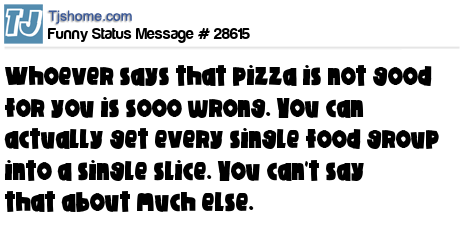 X Whoever says that pizza is not good for you is sooo wrong. You can actually get every single food group into a single slice. You can't say that about much else.