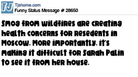 X says Smog from wildfires are creating health concerns for resedents in Moscow. More importantly, it's making it difficult for Sarah Palin to see it from her house.