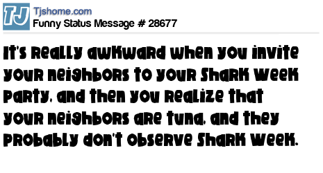 X says it's really awkward when you invite your neighbors to your Shark Week party, and then you realize that your neighbors are tuna, and they probably don't observe Shark Week.