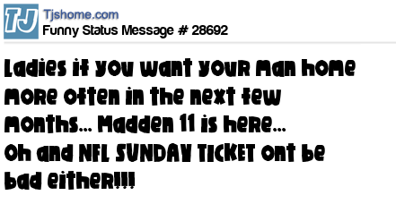 X says Ladies if you want your man home more often in the next few months... Madden 11 is here... Oh and NFL SUNDAY TICKET ont be bad either!!!