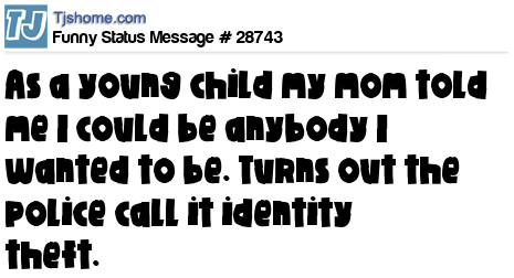 - # 186101 When I was a kid, my parents told me I could be anyone I wanted to be. Turns out, this is called "Identity Theft".
