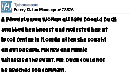X is A Pennsylvania woman alleges Donald Duck grabbed her breast and molested her at Epcot Center in Florida after she sought an autograph. Mickey and Minnie witnessed the event. Mr. Duck could not be reached for comment.