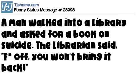 - # 22792 A man goes into a library and ask for a book on suicide....The librarian replies "F*ck off! you wont bring it back!"