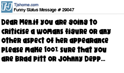 I'm not stuck up at all....it was a JOKE!A joke for gods sake!I am not stuck up..nor do I paticularly favour the likes of Dep or Pitt....I have no problem with corpulance,male pattern allopecia etc.The celeb I most favour would be Jack Black but it didn't go with the comment.I wrote the status because someone had been extremely and un necassarily rude about my appearance.I think it's fair to say that there are statuses on here that are far more offensive.It worked as a status on my profile because my friends knew I didn't mean it!Unfortunately it seems that everyone here now thinks I have a rubbish personality to go with my fat ass! I apologise to anyone whose self esteem is as low as mine and in future I will not defend myself!There are folks on here slagging off countries,and religions why not have a go at them?