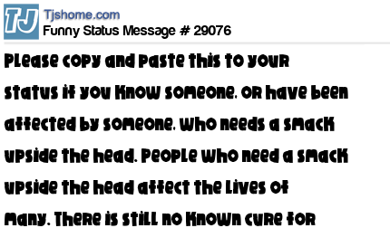 X is Please copy and paste this to your status if you know someone, or have been affected by someone, who needs a smack upside the head. People who need a smack upside the head affect the lives of many. There is still no known cure for someone who needs a smac
