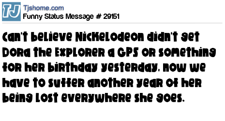 X can't believe Nickelodeon didn't get Dora the Explorer a GPS or something for her birthday yesterday, now we have to suffer another year of her being lost everywhere she goes.