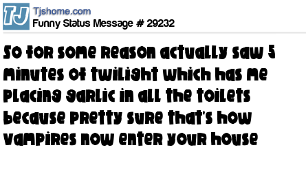 X is so for some reason actually saw 5 minutes of twilight which has me placing garlic in all the toilets because pretty sure that's how vampires now enter your house