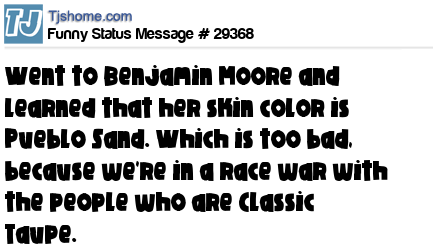 X went to Benjamin Moore and learned that her skin color is Pueblo Sand. Which is too bad, because we're in a race war with the people who are Classic Taupe.