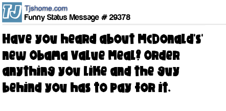 - # 18567 Have you heard about McDonald's' new Obama Value Meal? Order anything you like and the guy behind you has to pay for it.
