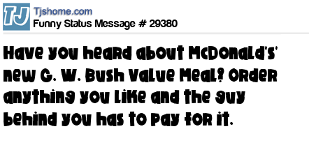 X is Have you heard about McDonald's' new G. W. Bush Value Meal? Order anything you like and the guy behind you has to pay for it.