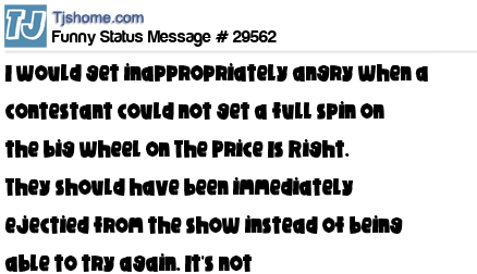 X  I would get inappropriately angry when a contestant could not get a full spin on the big wheel on The Price Is Right. They should have been immediately ejectied from the show instead of being able to try again. It's not kindergarten.