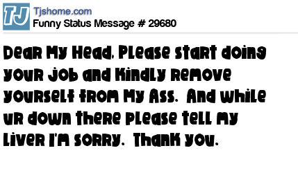 X is Dear My Head, Please start doing your job and kindly remove yourself from My Ass. And while ur down there please tell my liver I'm sorry. Thank you.